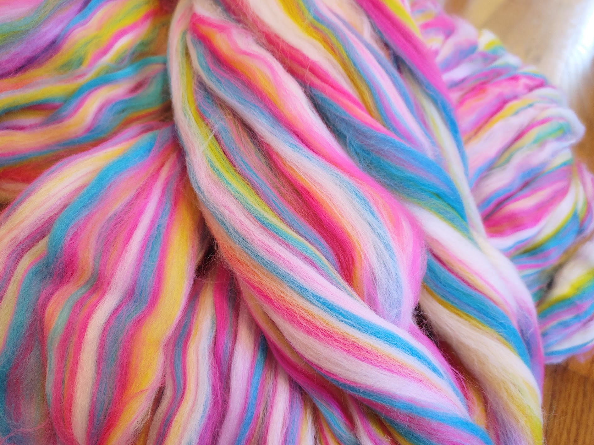 Humbug Jacob top, Indulgent Tart (Polwarth blend), Caffe Rosa, Peach Corriedale, Elderberry Corriedale, Merino purple blend, 2 colors of Bamboo.